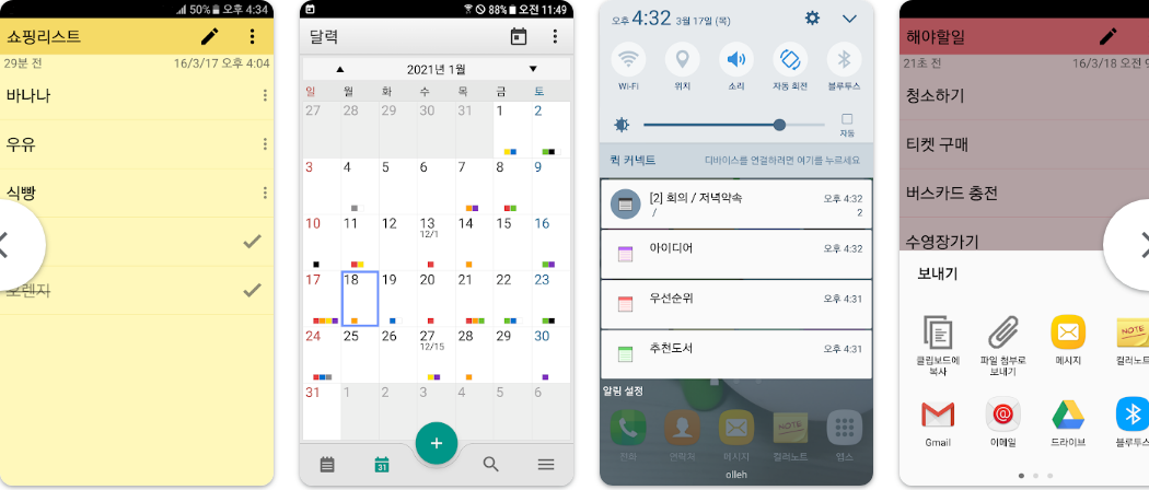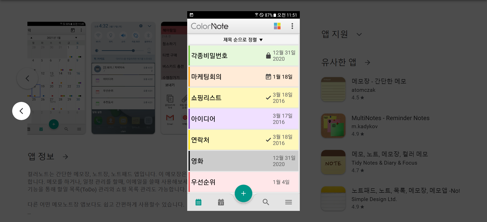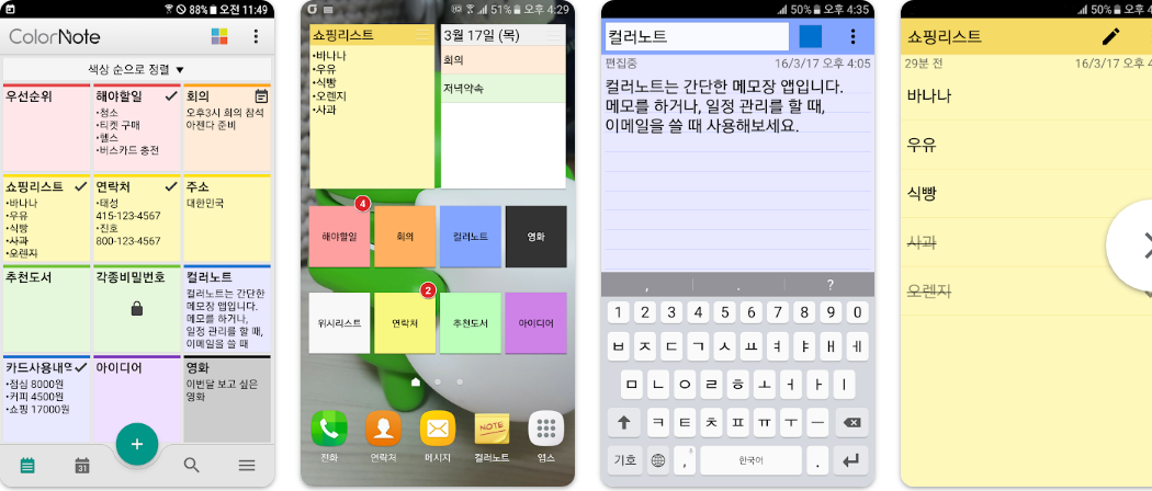 컬러노트, 일정, 할 일 목록, 쇼핑 목록, 임시 메모